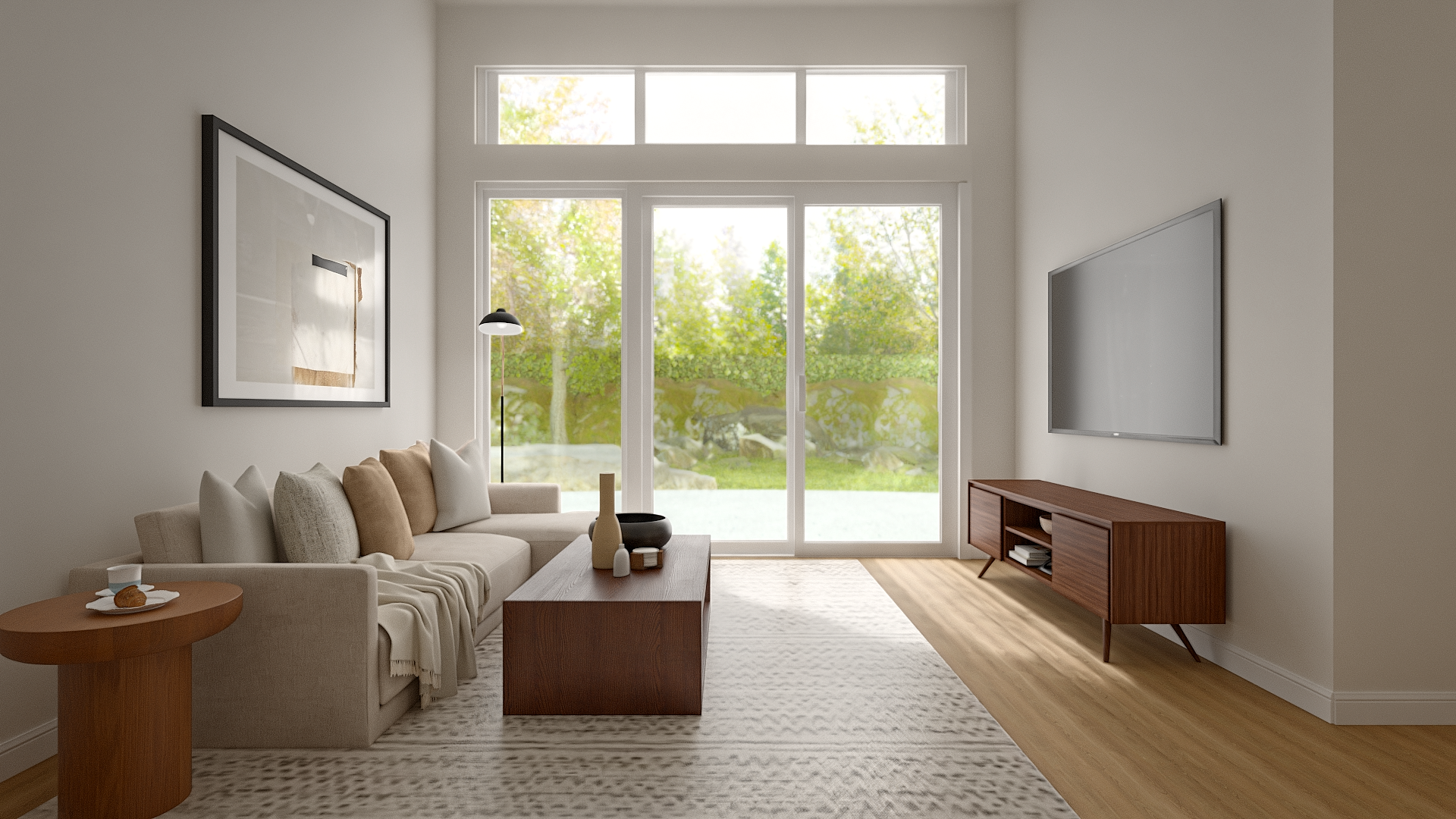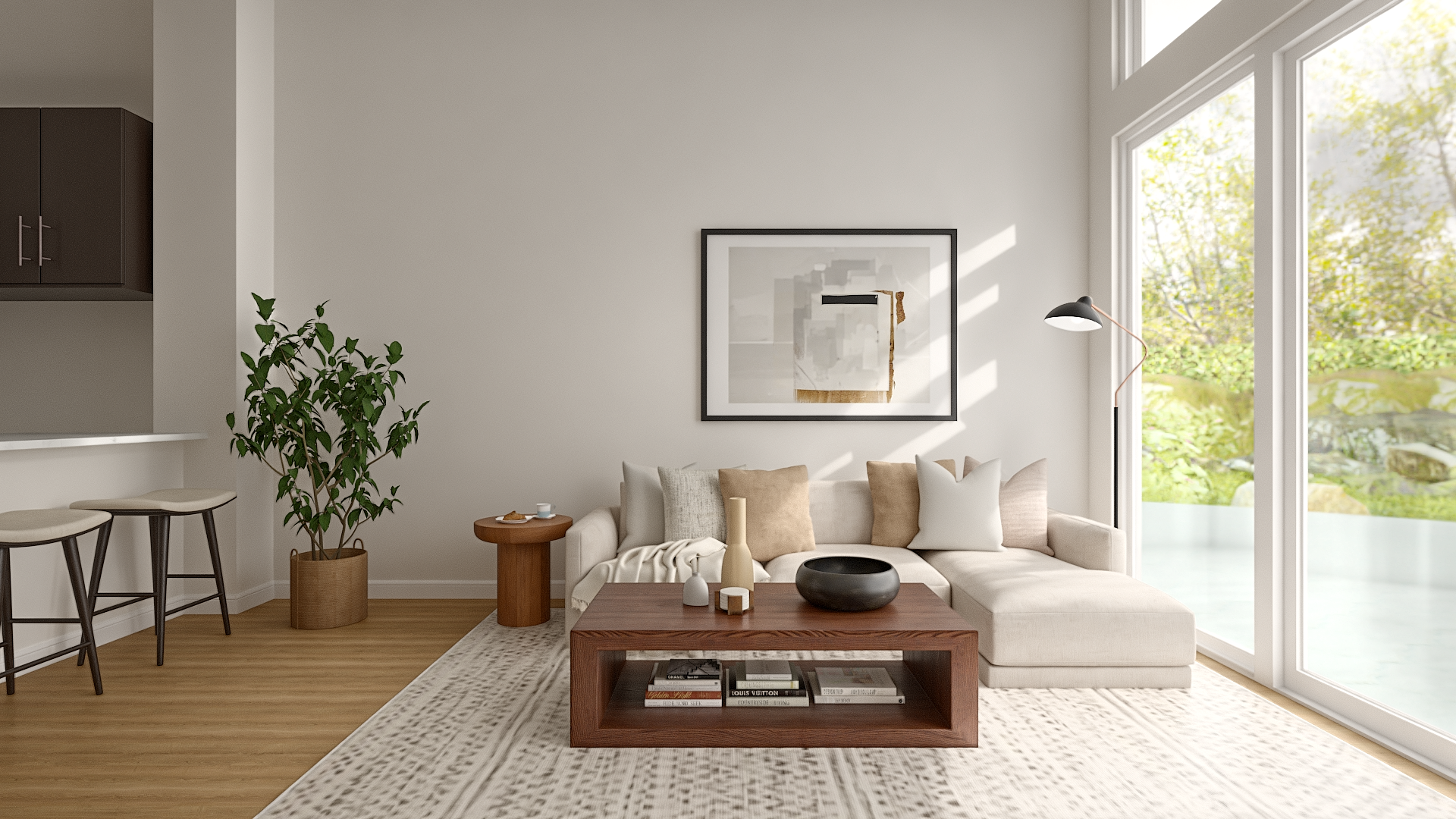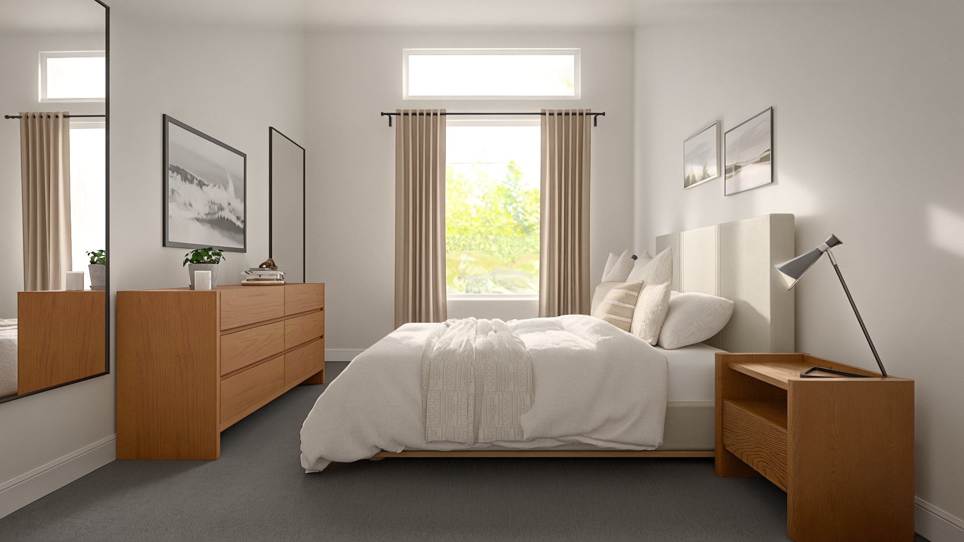 A warm, pared-back apartment design for a Phoenix client drawn to the understated aesthetic of Buck Mason. The space blends mid-century and Scandinavian influences with a masculine edge — think clean lines, warm wood tones, neutral textiles, and just enough texture to keep it interesting. The living room features a low-profile cream sectional, walnut coffee table with open storage, and a mid-century media console. The bedroom carries the same quiet confidence with natural oak furniture, soft linen bedding, and moody black-and-white photography. Designed to feel effortlessly put-together without trying too hard.